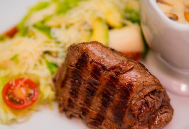 Carnes jugosas preparadas a la parrilla con sabores intensos y acompañamientos frescos.